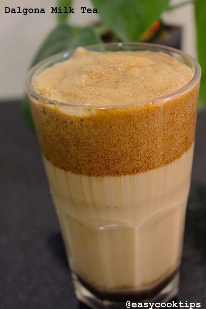 Dalgona Milk Tea Recipe | Variety Tea Recipe | Variation to the Dalgona Coffee Recipe with Video Recipe. Dalgona Coffee recipe is a popular and viral recipe now in net. Dalgona coffee recipe is originated from South Korea. The main difference of Dalgona coffee from the normal coffee is it’s creamy toppings. I am not yet tried that recipe of Dalgona coffee as I am not a coffee lover. I think many people are there, who are non coffee lovers like me. Don’t worry, here is a variation to the Dalgona coffee recipe, for tea lovers, that is Dalgona milk tea. It’s preparation is totally different from that of the Dalgona coffee recipe. Here I whisked two egg whites for getting the creamy texture. Added the tea powder and sugar in water and boiled it until the syrup thickens. Pour this hot syrup over the whisked egg mixture. This hot syrup will make the egg whites safe to eat. You won’t get the taste of egg in this tea recipe. The texture of the Dalgona milk tea will be same as that of the Dalgona coffee and it will tastes delicious also. So, try this variety tea recipe, when your making tea next time. I am sure that you will like the taste of this tea. Let us come to the recipe and let me know your feedback.
