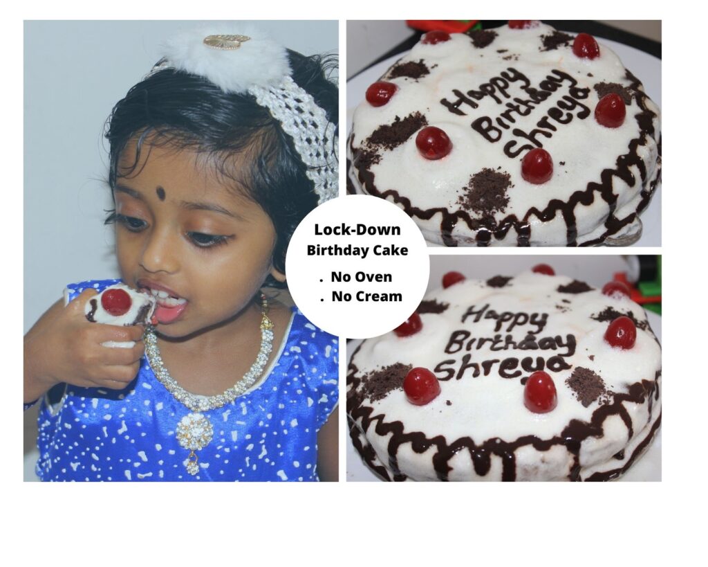 Lock-Down Birthday Cake Recipe | Easy Black Forest Cake Recipe Without Oven | How to Make Whipping Cream With Egg Whites with Video Recipe. Today I am sharing here with you all the recipe of the Black Forest Cake that I made for my daughter’s birthday. Blackforest cake is a layered chocolate sponge cake sandwiched with cherries and whipping cream. This time my daughter’s birthday was on coronavirus lockdown period so we couldn’t make it to a big celebration. We used to order birthday cake for her birthdays, but this time I thought to make cake at home. I was in search of a simple cake that I can make for her birthday, my search ended up in this black forest cake. Black Forest cake is an easy to make cake recipe that anybody can make without any experience in cake making. When I thought to make black forest cake for her birthday, I started to search for the whipping cream in stores, but I couldn’t find any whipping cream in any stores, so thought to make whipping cream at home with egg whites. It was my first attempt to make whipping cream at home, but it came out well for me, I thought to share that recipe also with you all as it will be helpful for many who are planning to make birthday cake during this lockdown period as we won’t get whipping cream from stores. I have explained the steps in detail with video recipe in this post. Please watch the video recipe that I am posting at the end of this post. This cake is very easy to make and anybody can make this cake without any prior experience in making cakes. Try this recipe and let me know your feedbackPreparation Time:2 hour