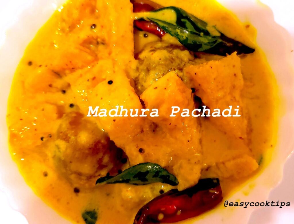 - Tasty Madhura Pachadi is ready to serve as a side dish for rice