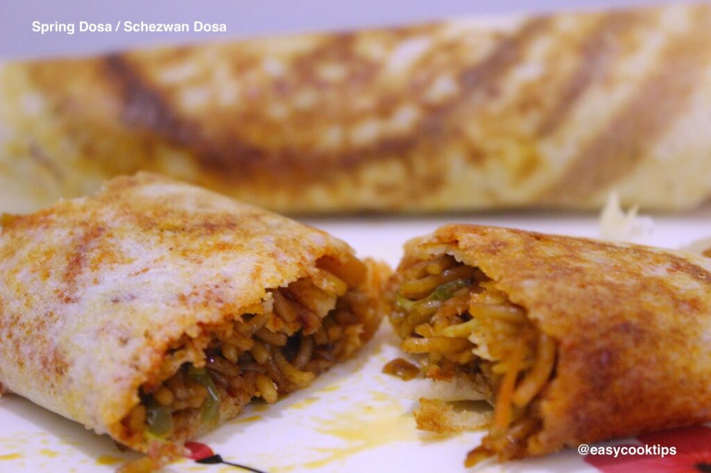 Here comes another recipe with schezwan chutney, This is the recipe of a dosa, which has schezwan flavor in it. That is spring dosa/schezwan dosa.This is a popular street fast food of India, especially in Mumbai streets. It’s preparation is similar to that of masala dosa. Instead of potato masala filling in masala dosa, this dosa is filled with stir fried veggies and noodles. In masala dosa, we will apply red chutney on top of dosa, but in spring dosa/schezwan dosa, instead of red chutney, we are applying schezwan chutney on top of dosa. If you want to try some varieties in the dosa recipes that you used to prepare, then definitely try this recipe. If ur kid is a noodles lover and won’t eat dosa, then u can try this trick to make them eat dosa. They will eat it because we put noodles inside this dosa. Try this recipe and let me know how it turned out for you